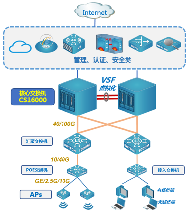 相信凯发一触即发已经对它有了深刻的了解,但凯发一触即发也知道,客户在实际应用中不是简单的使用一台网络设备,而是使用的是网络,也就说客户需要的是由多类产品进行逻辑组合的网络方案,那么今天凯发一触即发看一下,CS16000系列交换机产品和它的网络兄弟产品可以形成哪些网络方案?